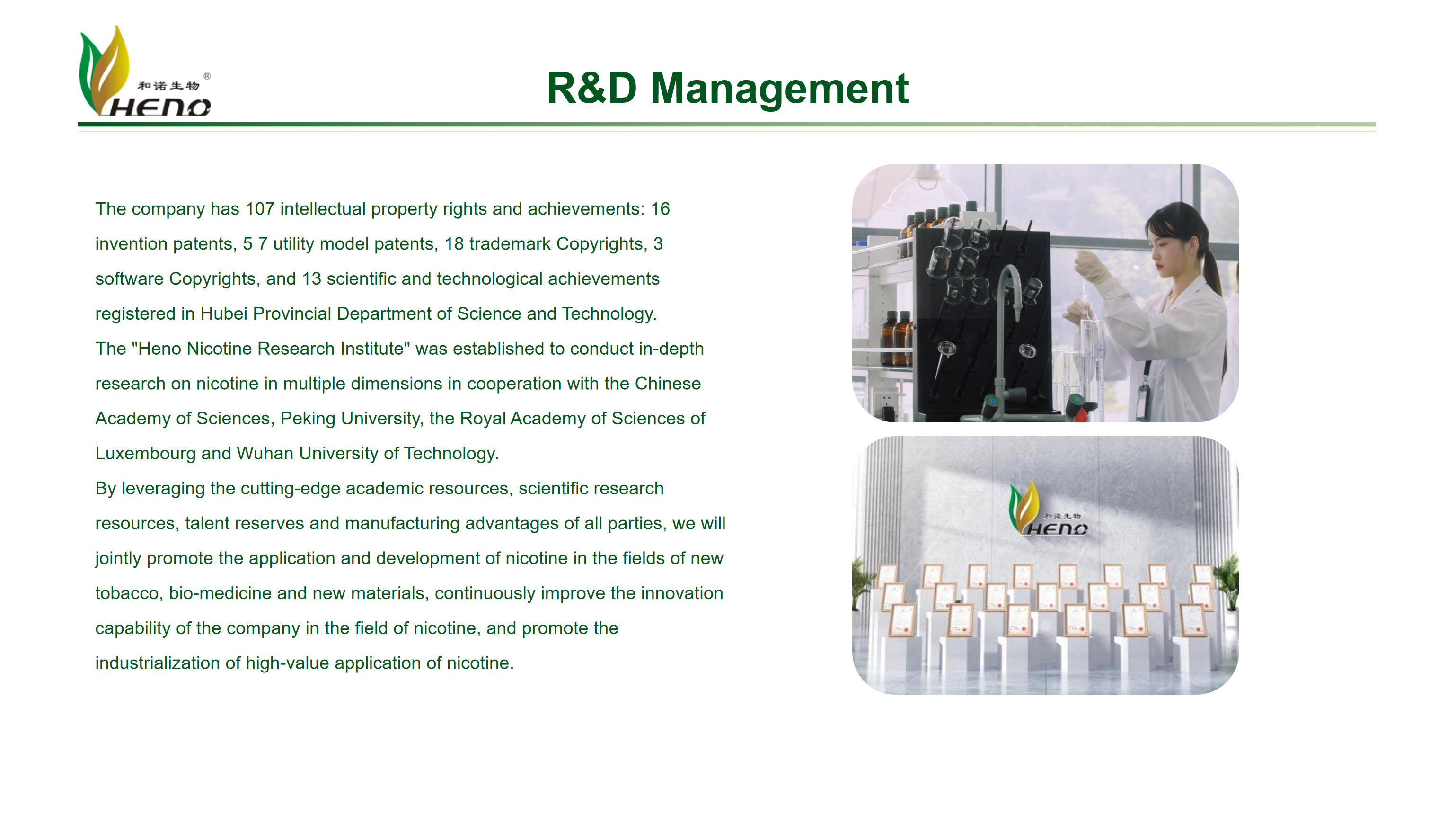 2011年に設立された湖北省河野生物工程有限公司は、 中国における技術と資源主導の企業であり、 タバコ廃棄物の循環利用。14年間の献身的な取り組みを経て 開発において、私たちは 国家「リトルジャイアント」企業(高度に専門化され革新的な中小企業に与えられる名誉ある称号)企業、国家知的財産優位企業、そして 省立グリーンファクトリー。107件の知的財産権を保有しています。 16件の発明特許を含む当社のブランド「HENO Bio」は、 複数の国で登録されており、湖北省優良商標として知られています。